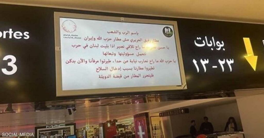 وظهرت على شاشات مطار بيروت رسائل إلى “حزب الله وأمينه العام السيد حسن نصرالله، باسم الرب والشعب”، تُطالبهما بعدم إقحام لبنان في حرب وتتهمهما بإدخال السلاح عبر المطار.