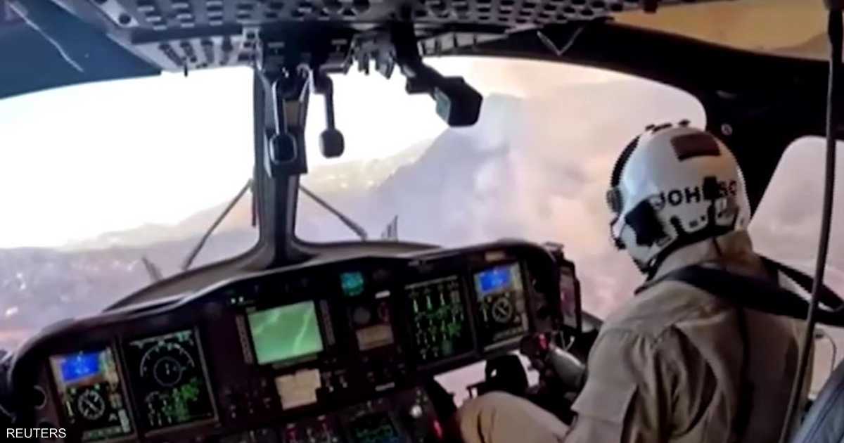 ويظهر في الفيديو الطياران وهما يسقطان من مروحية المياه وموادا مثبطة للنيران على تلال في باليساديس.