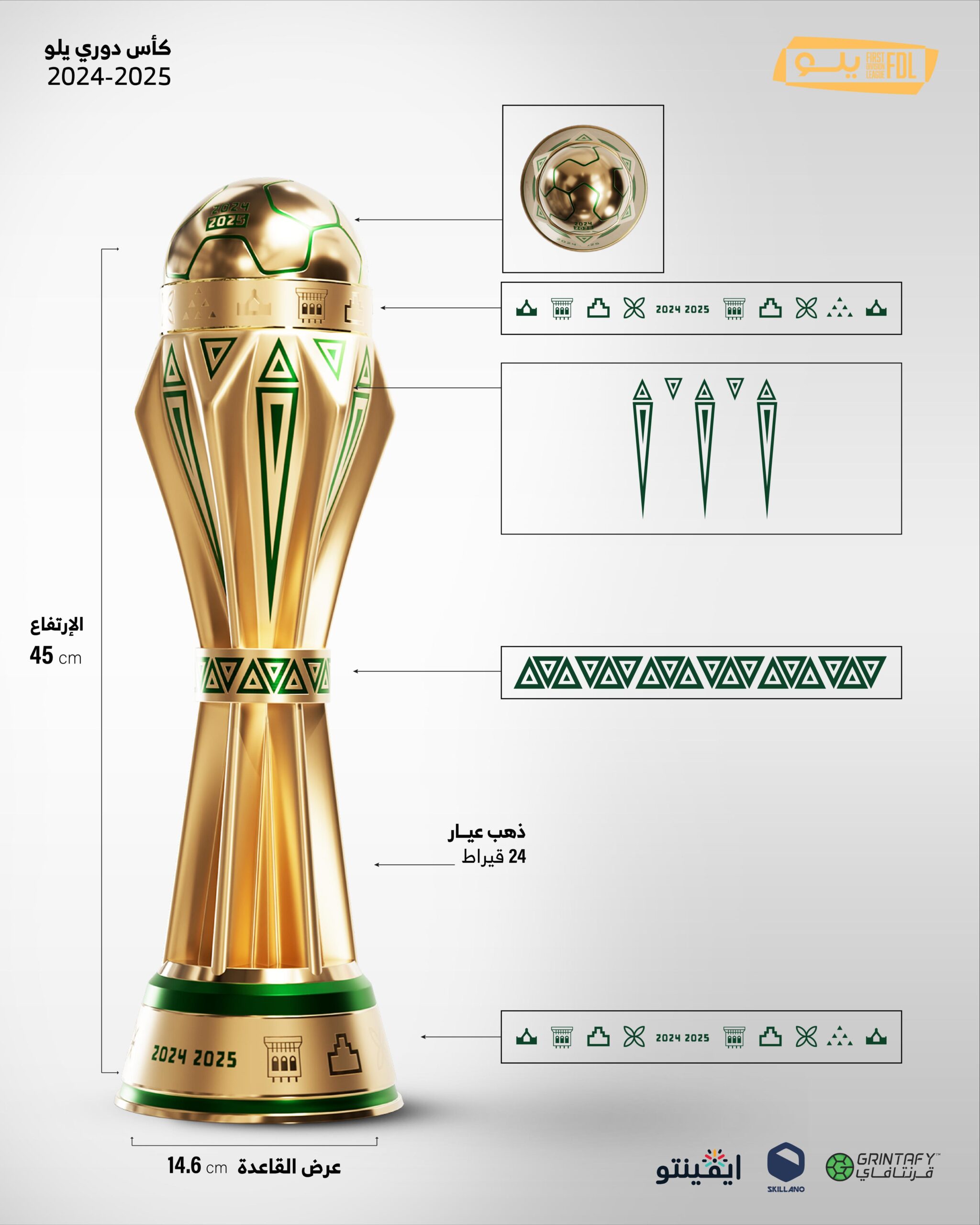 ويبلغ ارتفاع الكأس الجديدة 45 سم وعرض قاعدته 14 سم، فيما تزين بتصميمات بالنقش السلماني تعكس الهوية التراثية للمملكة، ويعتلي الكأس كرة قدم مطلية بالذهب الخالص في وسط قاعدة تزينت بالنقش السلماني.