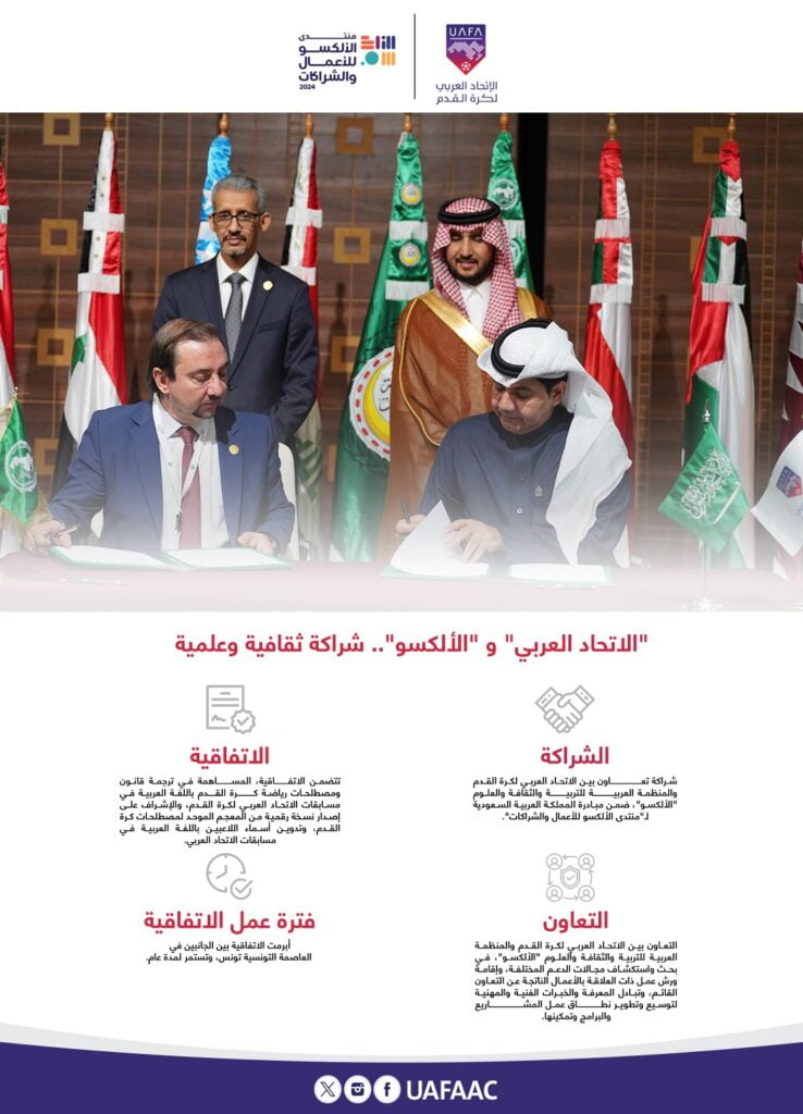 بحضور الدكتور رجاء الله السلمي الأمين العام للاتحاد العربي لكرة القدم، والمدير العام لمنظمة “الألكسو” معالي الدكتور محمد ولد أعمر ورئيس المجلس التنفيذي للمنظمة العربية للتربية والثقافة والعلوم “الألكسو”، رئيس اللجنة العليا لمنتدى الألكسو للأعمال والشراكات، الأستاذ هاني المقبل، أُبرمت اليوم في العاصمة التونسية تونس، اتفاقية تعاون مشترك بين الاتحاد العربي لكرة القدم والمنظمة العربية للتربية والثقافة والعلوم “الألكسو”، لرفع مستويات الوعي بالرياضة والثقافة في الوطن العربي.