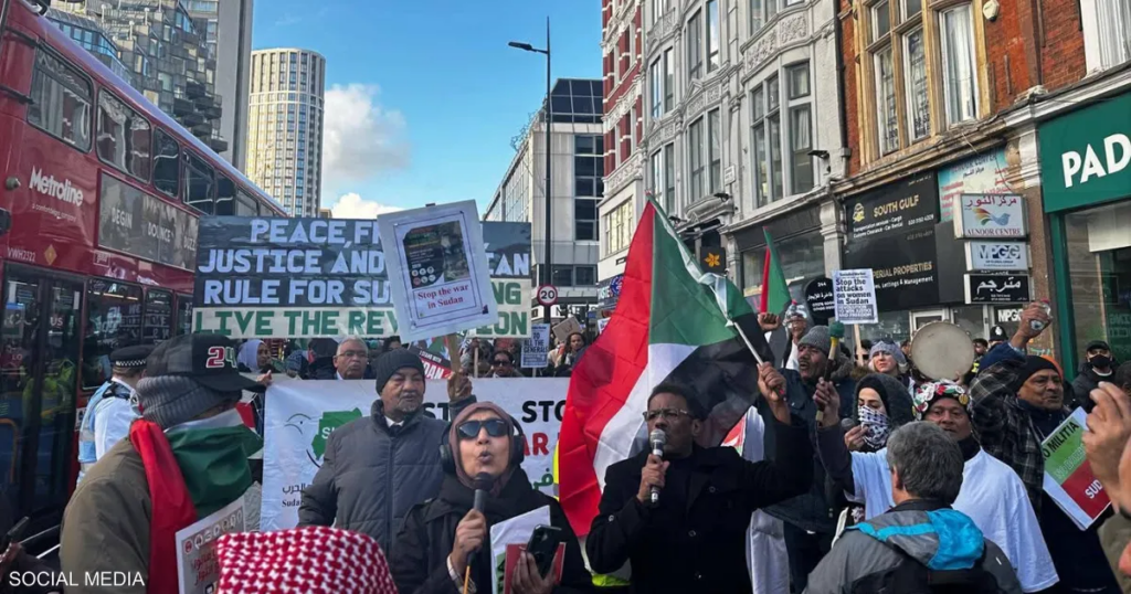 ورفع المشاركون في الوقفة لافتات ضد تنظيم الإخوان في السودان، مؤكدين دعمهم لإنهاء الحرب ومحاسبة المتورطين فيها.